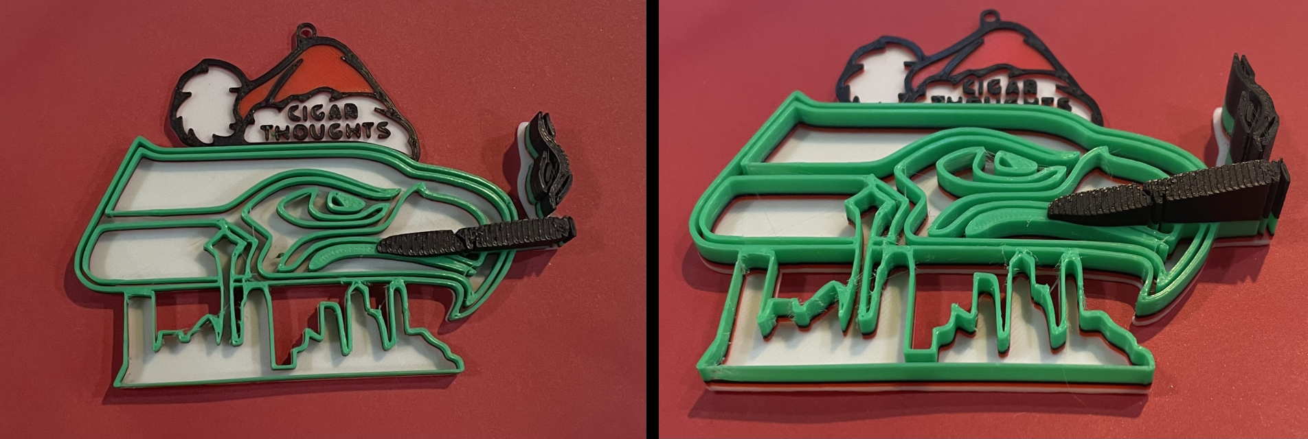 As Seahawks fans we often read the Cigar Thoughts blog, I decided to send the writer a variant of my Seahawks Christmas ornament, this one with the name of his blog and a cigar sticking out sideways |